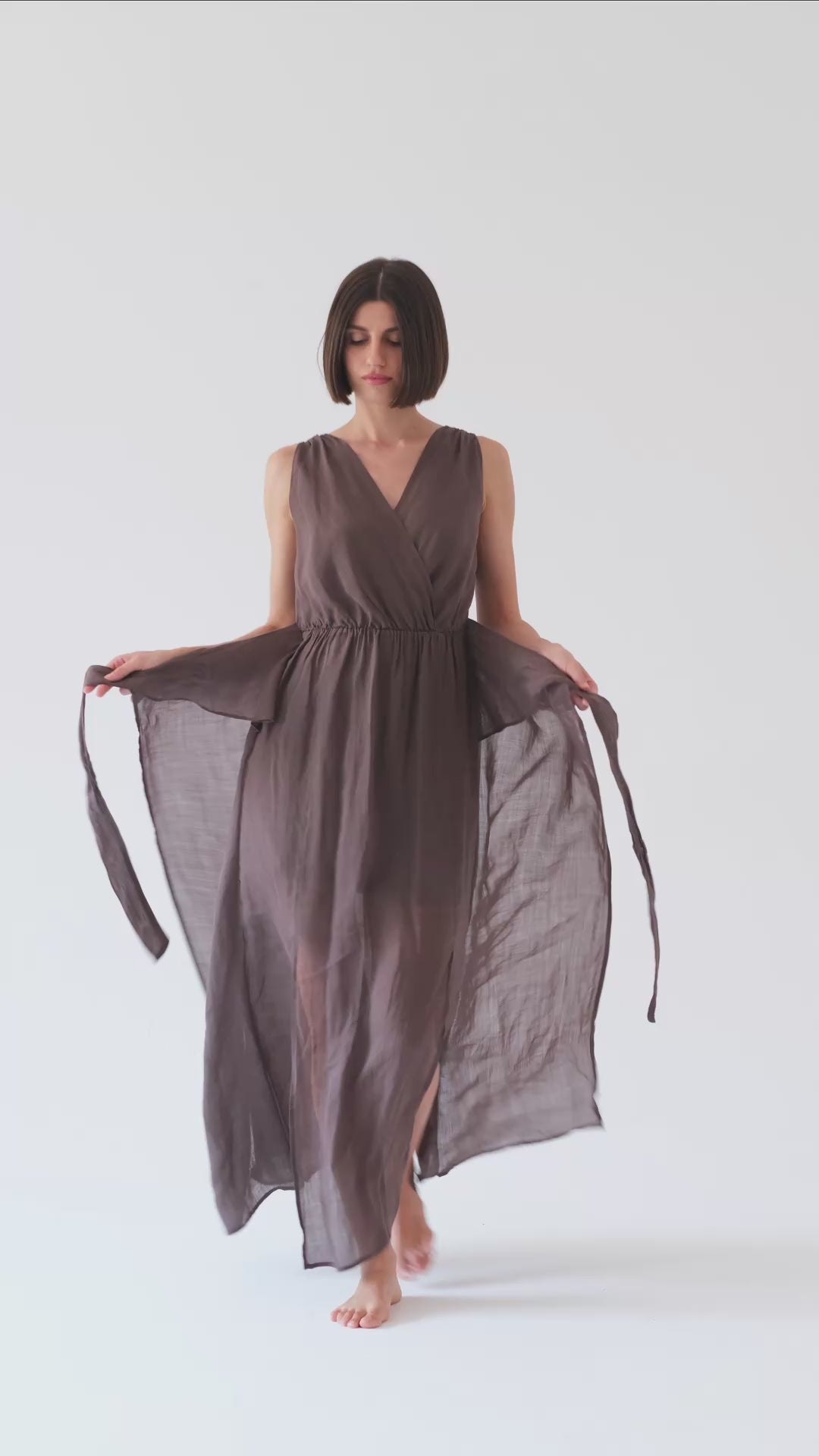 Cut from sheer, natural ramie in a rich Cocoa brown, this modular dress blends effortless ease with refined sophistication. Garment dyed and stone washed, the fabric takes on a subtly faded tone and exceptionally soft hand, giving it a lived-in character while retaining its ethereal lightness. Designed to twist, wrap, and adjust, it flatters every shape with fluid movement - a timeless expression of individuality and modern elegance.