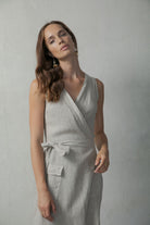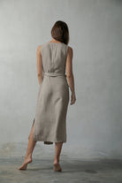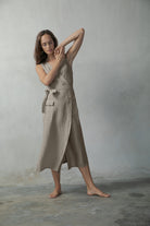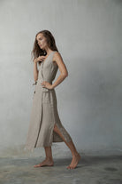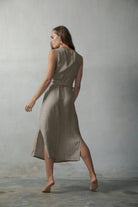 Cinch in your waistline and create a flattering silhouette or tie it on the side for a stylish detail. Front patch pockets and side splits allow for relaxed movement and easy wear. Our oatmeal beige midi dress is a go-to choice for the daytime and is formal enough to be dressed up for the evenings.