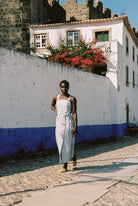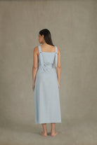 The Volonté Sky Blue Midi Dress delivers a classic design for the modern woman. A square neckline, side pockets and adjustable straps balance function with style. Its tailored fit provides structure and a polished look, while the wrap ties can be used to cinch the waist.Oversized tortoiseshell buttons and the fresh sky colourway complete the look.